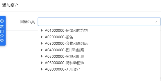 根据实际需要入账的资产选择相应的资产分类。在国标分类栏输入资产的关键字,如无对应的国标分类,则选择最接近类似的或者该类里其他。